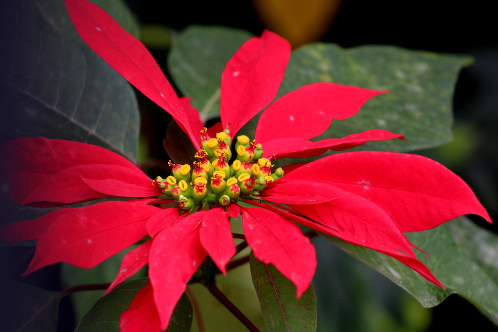 TIEDÄTKÖS, nuo suuret punaiset lehdet kasvissa, eivät oikeastaan ole terälehtiä. Ne ovat itse asiassa muunneltuja lehtiä, joita kutsutaan suojuslehdiksi. Entä nuo pienet jutut keskellä? Niitä usein virheellisesti kutsumme kukiksi, mutta nekään eivät teknisesti ottaen ole kukkia. Nuo pienet keltaiset keskellä edustavat itse asiassa kukintoa, jota ympäröivät vielä muunnellummat lehdet. (kuva Laura Uribe)