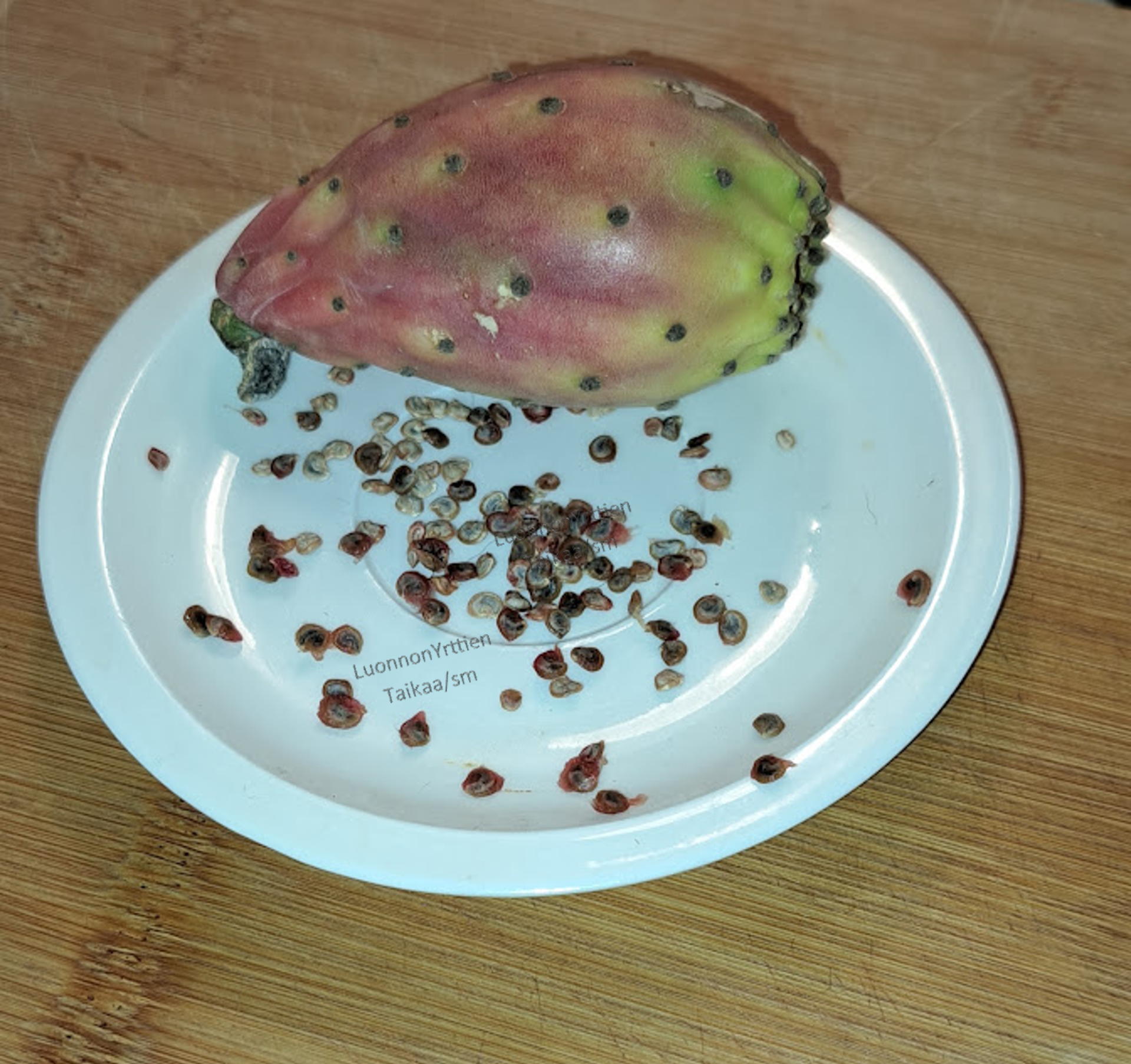 Kuori hedelmä varoen piikkien takia. Onnistut siinä, kun harjaat piikit pois tai käytät hanskoja. Poista hedelmän päät ja viillä hedelmä auki pituussuunnassa, sen jälkeen kuori lähtee vaivatta. Huomaat myös, kuinka paljon pieniä siemeniä se sisältää ne ovat kaikki syötäviä. Näistä pienen pienistä siemenistä olen kasvattanut oman kaktusviikunani.