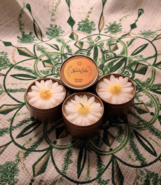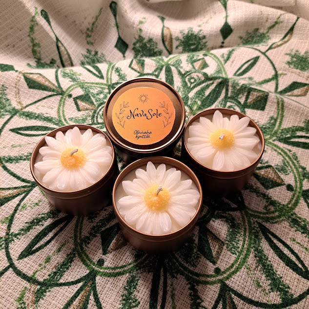 Soijavaha ja oliivivahasta tehtyjä 100ml kullanvärisiä astiakynttilöitä. Päivänkakkara koriste on oliivisteariini/parafiiniseos. Polta kynttilää palamattomalla alustalla. Polton kestävyyden takaamiseksi leikkaa ylipitkää palanutta kynttilänsydäntä polttojen välillä. Astiakynttilä palaa 18h ja astia on palon jälkeen uudelleen käytettävissä. Vahojen jämät lähtevät pesussa hyvin pois, joten saat ihanan kultaisen astian, kun kynttilä on palanut loppuun. Hajusteettomia, ekologisia ja vegaanisia.